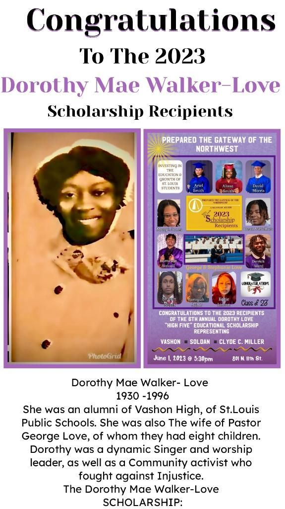 Prepared The Gateway Of The Northwest: Ceremony was held at St. Louis Public Schools Board of Education building located at 801 North 11th Street. June 1, 2023 @ 6:00pm. Three High schools Nominated students for the Dorothy Mae Walker-Love Scholarship Awards. Vashon High, Soldan International Studies and Clyde C. Miller High were the Chosen Schools this year. Ten Scholars were selected to receive the Scholarships by Board Members for their amazing essays.